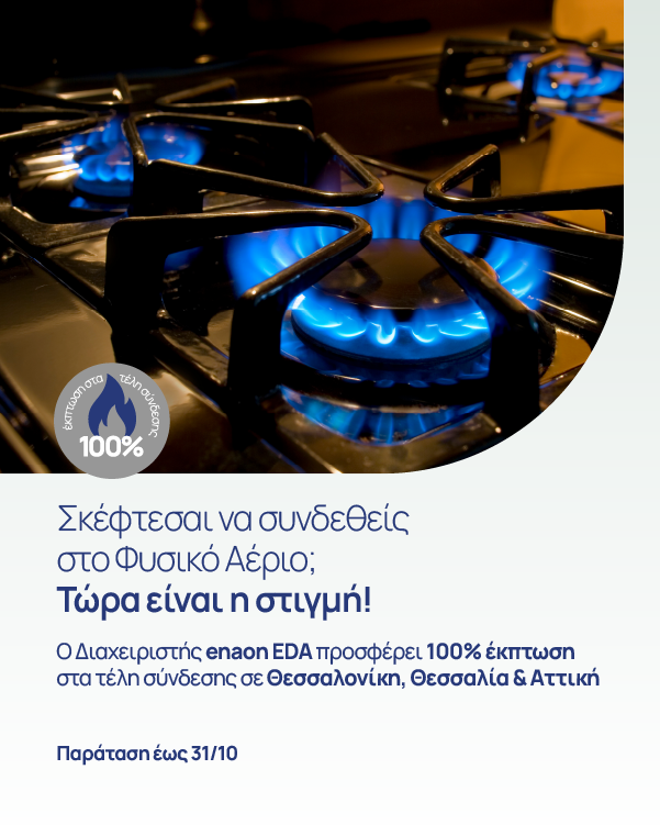 Ο Διαχειριστής Δικτύου Διανομής Φυσικού Αερίου enaon EDA ανακοίνωσε προσφορά 100 % έκπτωσης στα τέλη σύνδεσης για όσους επιθυμούν να συνδεθούν με τα δίκτυα φυσικού αερίου στις περιοχές Αττικής, Θεσσαλονίκης και Θεσσαλίας.